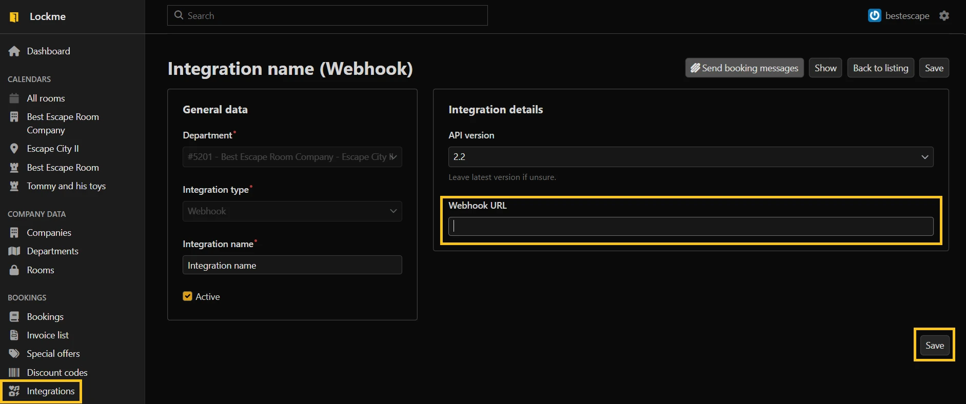 6. Go to "Integrations" (NOTE: If you do not have webhooks configured, please refer to the article > Webhook Configuration).
