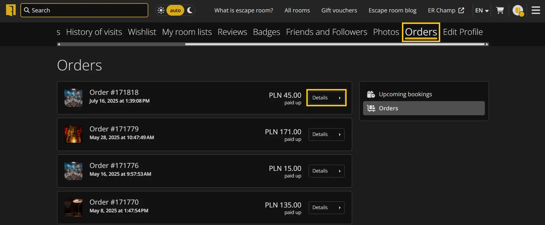 4. In the profile menu, go to the "Orders" tab.