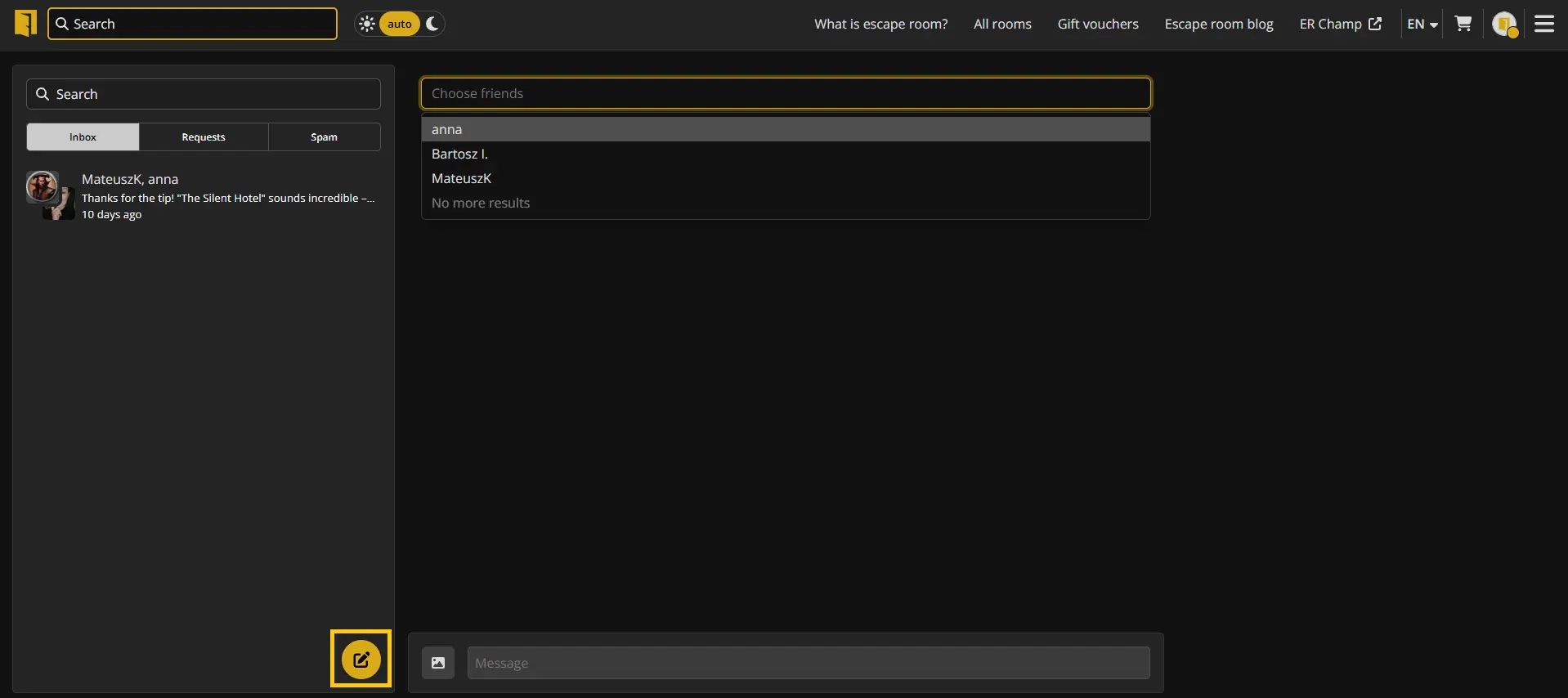 To start a new conversation, click the ✏️ button in the lower right corner of the screen (visible in the conversation list). Then select one or more friends with whom you want to have a conversation. The conversation will be created automatically when you add participants - you can start writing messages right away.