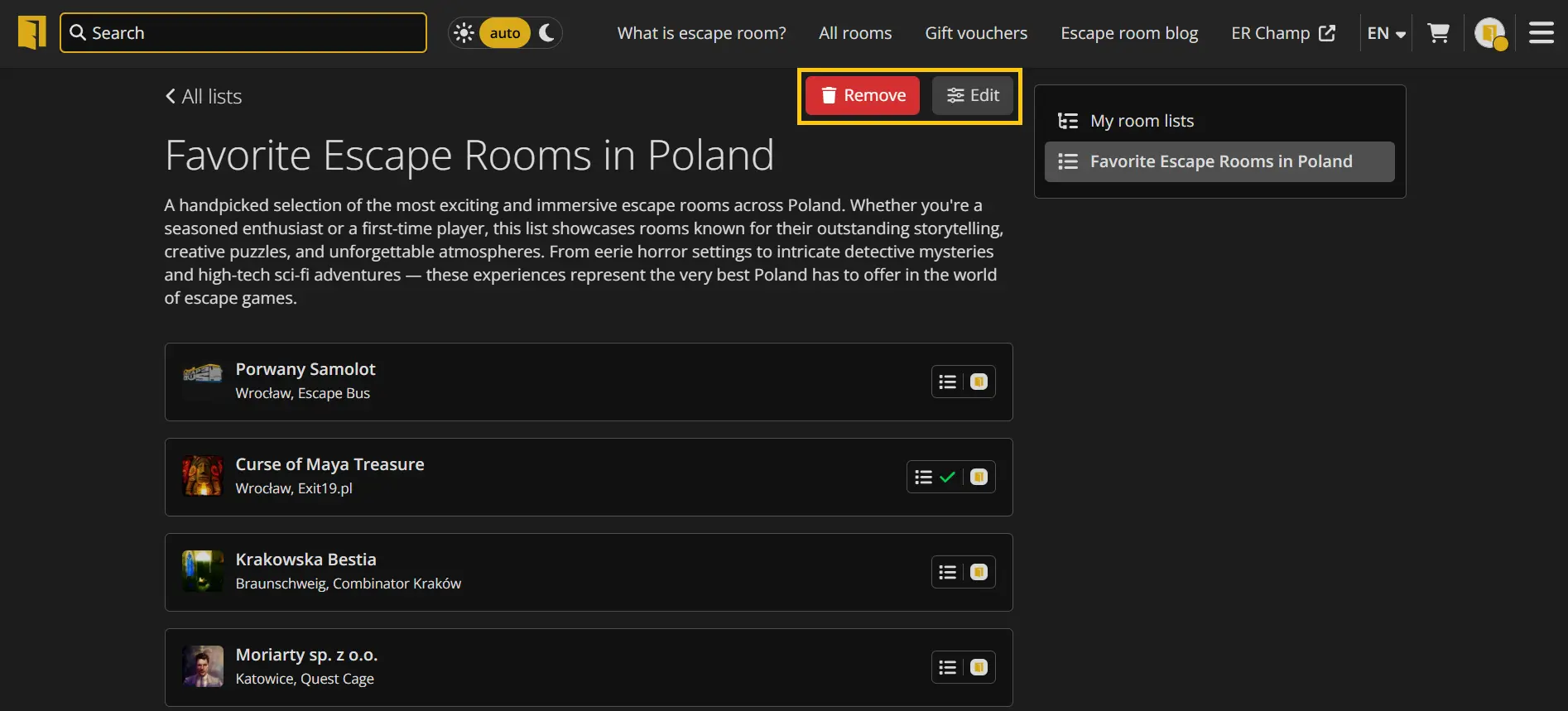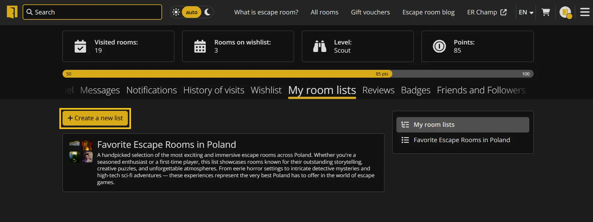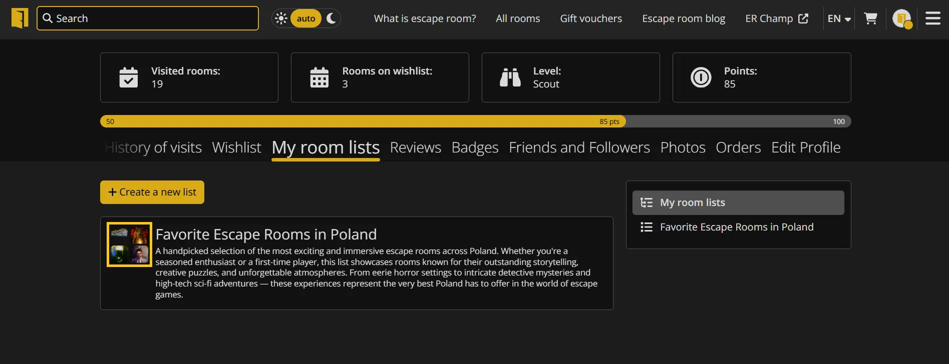 The "My Room Lists" tab allows you to create your own listings of escape rooms available on Lockme. Here you can group rooms according to any key - for example, favorites, thematic (horror, sci-fi), location (e.g. Wroclaw, Tricity), or rankings like "Top 10".