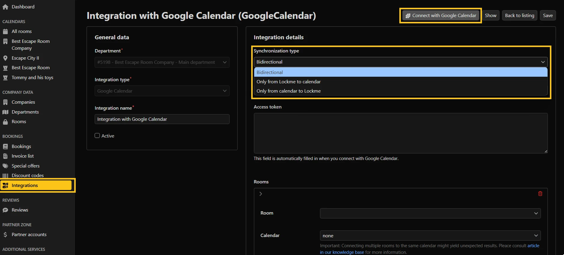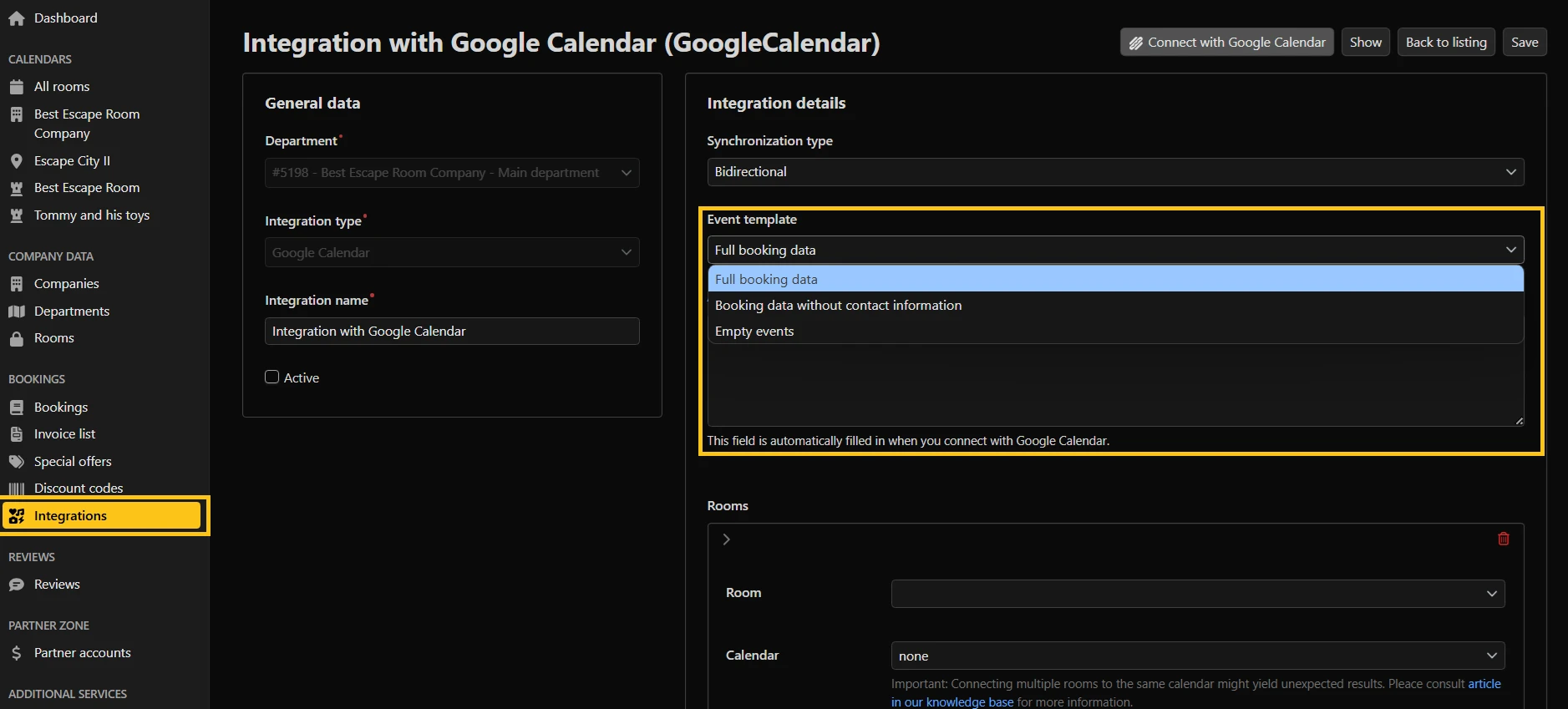 IMPORTANT: Avoid assigning multiple rooms to a single calendar, as this may cause problems with the calendar's operation in case of bidirectional integration.