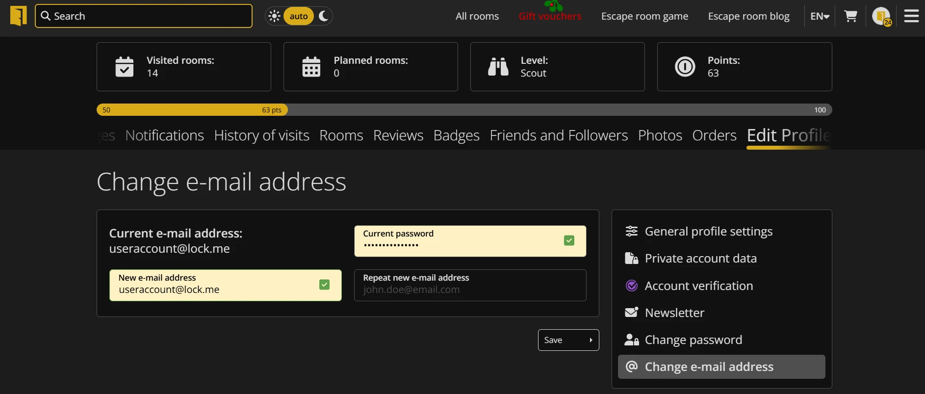 Tutaj możesz dostosować podstawowe informacje dotyczące Twojego profilu, takie jak nazwa użytkownika, zdjęcie profilowe, krótki opis czy ustawienia podsumowań. Ponadto, jeśli jesteś pracownikiem lub właścicielem Escape Roomu, zalecamy ograniczenie konta. Dodawanie opinii przez osoby pełniące takie funkcje jest niezgodne z regulaminem serwisu.