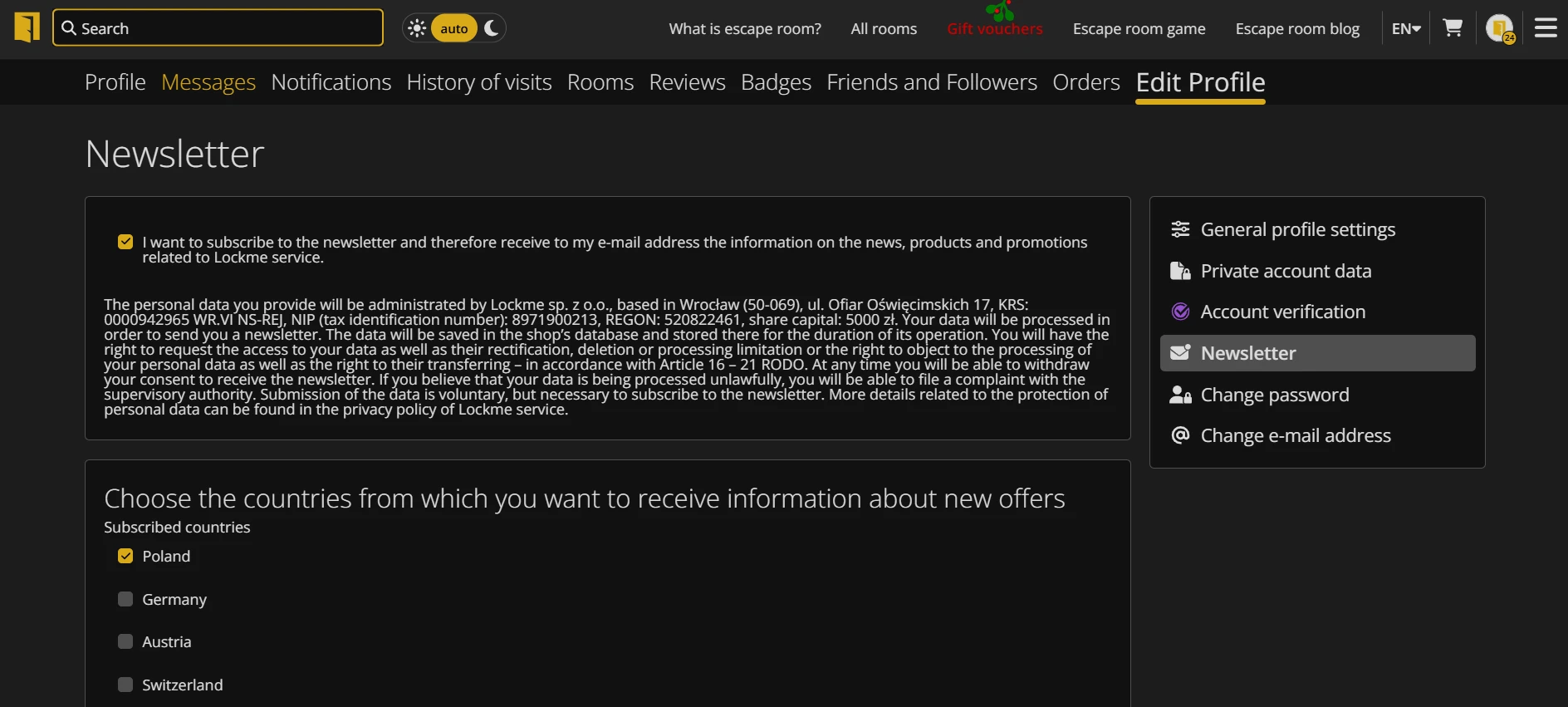 W tej zakładce możesz zarządzać subskrypcją newslettera. Możesz się na niego zapisać, aby otrzymywać aktualizacje dotyczące branży Escape Roomów z całego świata i nie tylko. Spersonalizuj swoje powiadomienia, wybierając kraje, które Cię interesują.