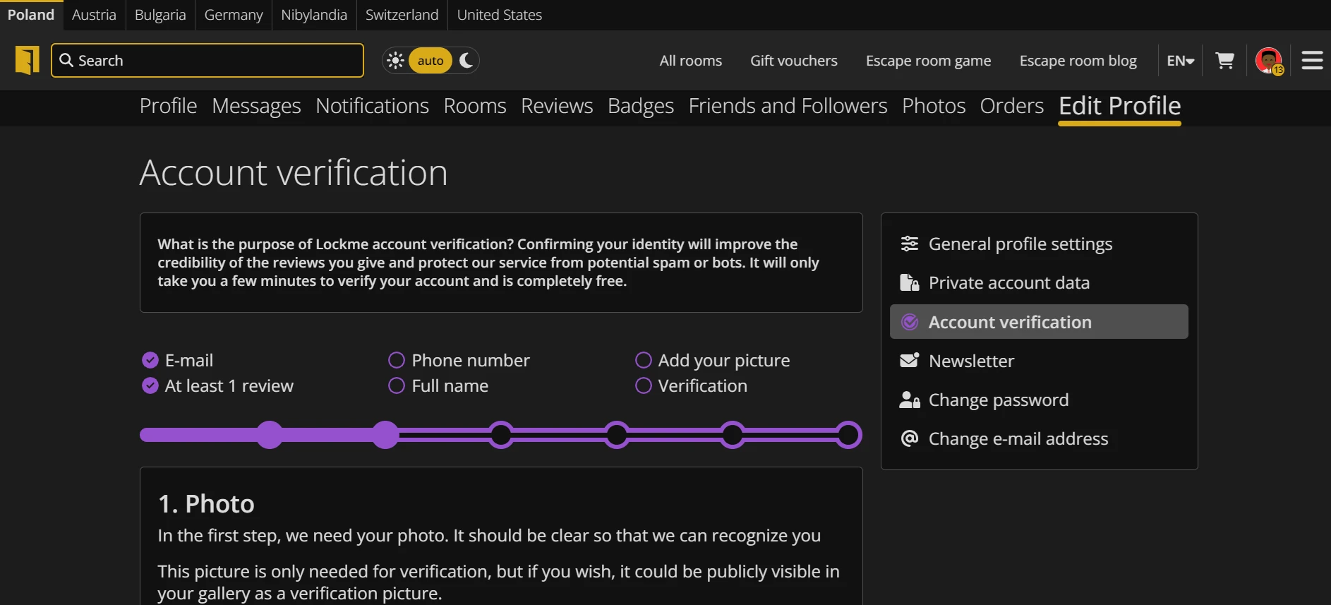 - Zdjęcie: Powinno być wyraźne, abyśmy mogli Cię rozpoznać. Zdjęcie służy wyłącznie do weryfikacji Twojej tożsamości. Możesz zdecydować, czy chcesz je udostępnić publicznie w swojej galerii, czy też zachować je jako prywatne.