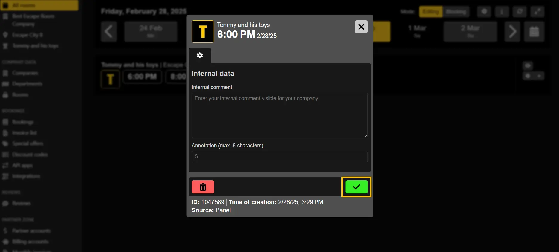 Once you add a reservation with the green button, it will appear in the calendar as a marked time slot. To open the reservation management and edit its details, just click on the added reservation in the calendar view.