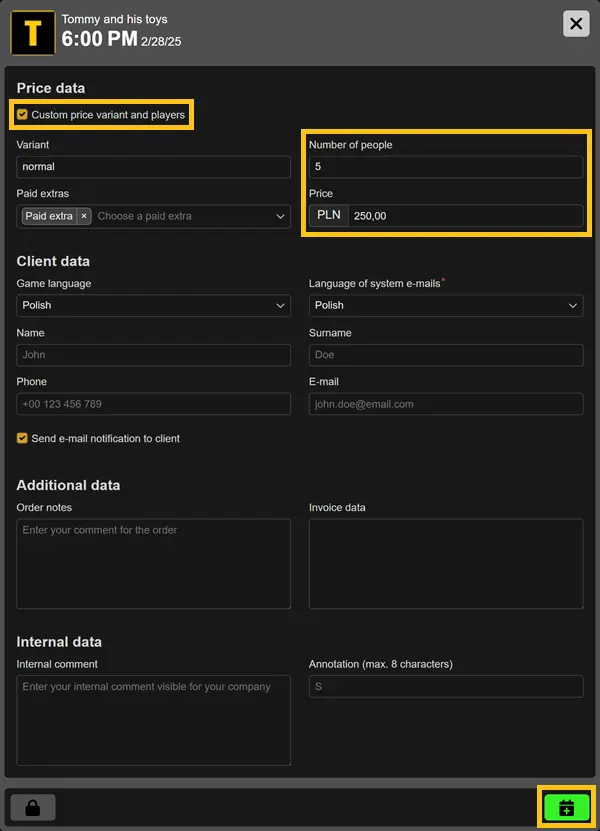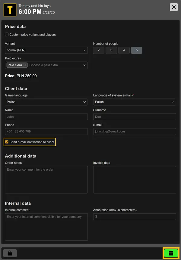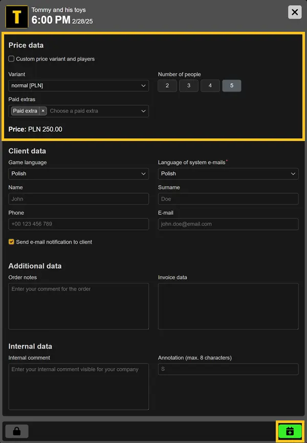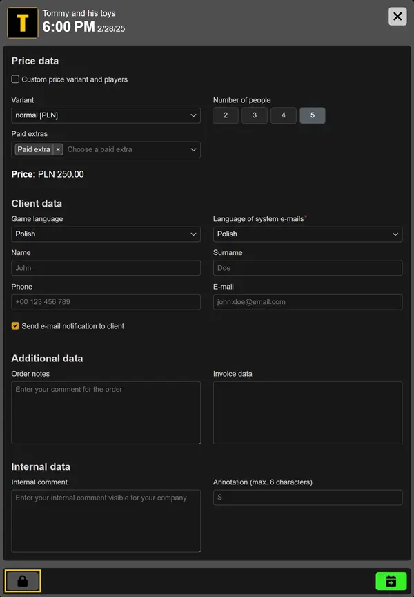 The booking form allows you to manually add a booking to your calendar. It allows you to enter basic data, such as information about the client and the date of the game. Read more about the available options later in this article.